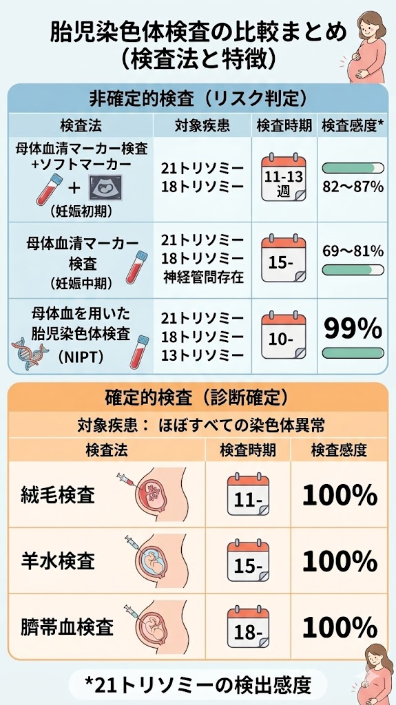 特に確定的検査は、妊娠週数が進むとリスクが高くなったり、選択肢が限られたりします。